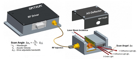 Акусто-оптический дефлектор (AODF) может осуществлять сканирование лазерным пучком путем изменения частоты ВЧ-сигнала. Положение сканирования может быть произвольным, осуществлять непрерывное линейное сканирование и последовательное поточечное отклонение, с точностью управления положением до нанорадиан. Оптимальная эффективность AODF обычно достигается для коллимированных пучков; несоответствие угла Брэгга возникает из-за того, что AODF может выполнять оптическое согласование только на одной частоте. Как правило, это приводит к снижению эффективности.